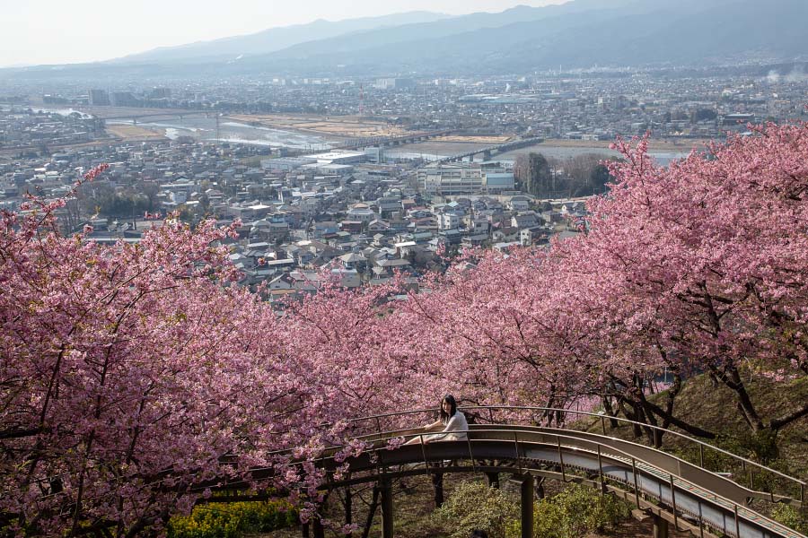 河津桜は染井吉野に較べると花季は長い方ですが、それでも春先の不安定なお天気や曜日回りを考えると見頃の日にちが限られるため、どうしても特定の日に集中して混雑が避けられません。 今回は2月24日に取材しましたが、好天に恵まれた日曜日ということから、酒匂川の河川敷に設けられた臨時駐車場も早朝から満車状態でした。 |