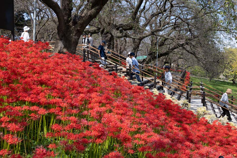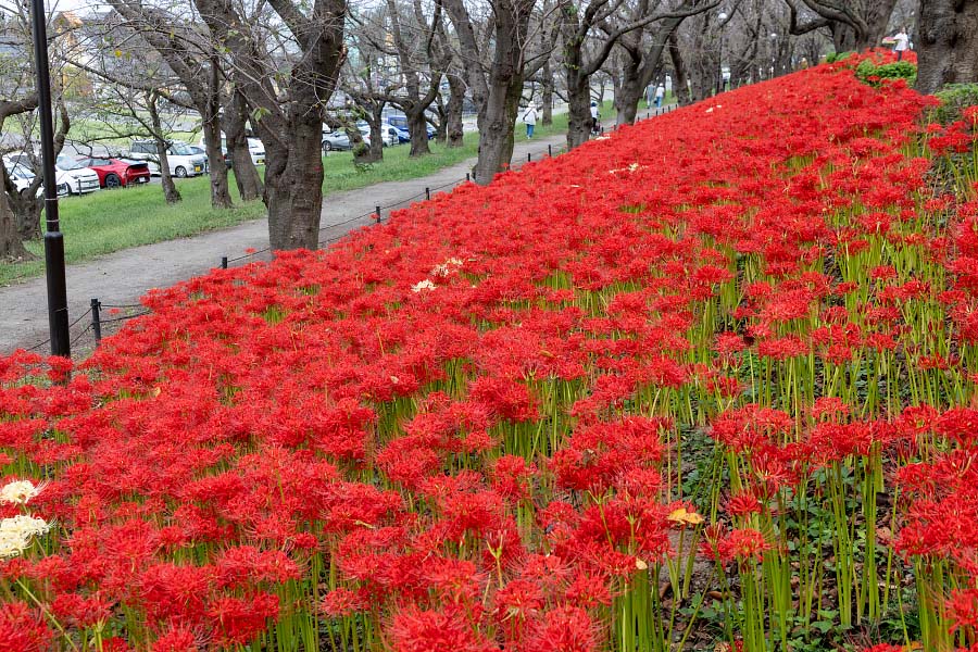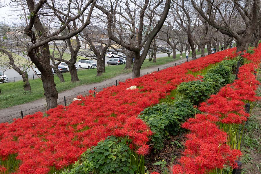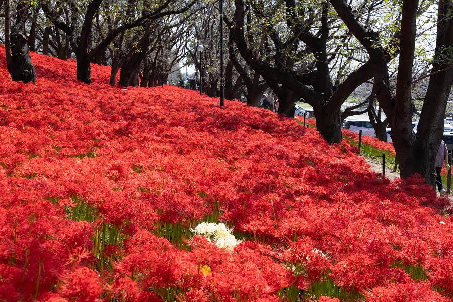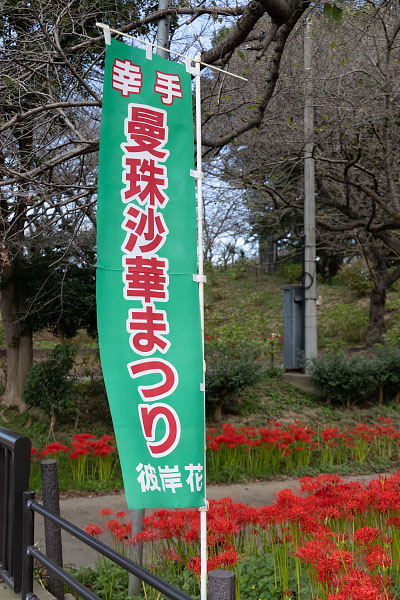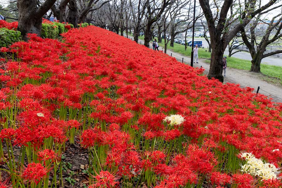 | 市の北部、旧利根川を挟んで茨城県と接する所にある権現堂堤という古い堤防の一帯が公園として整備されていて、春の桜や菜の花、夏のアジサイ、秋の彼岸花、冬のスイセンと四季折々の花木が楽しめるお花見の名所として一年を通じて多くの来訪者で賑わっています。 毎年この時期(今年は9/20〜10/5)には「曼珠沙華まつり」が開催され、約300万本の彼岸花が土手を深紅に染め上げて見事です。 |