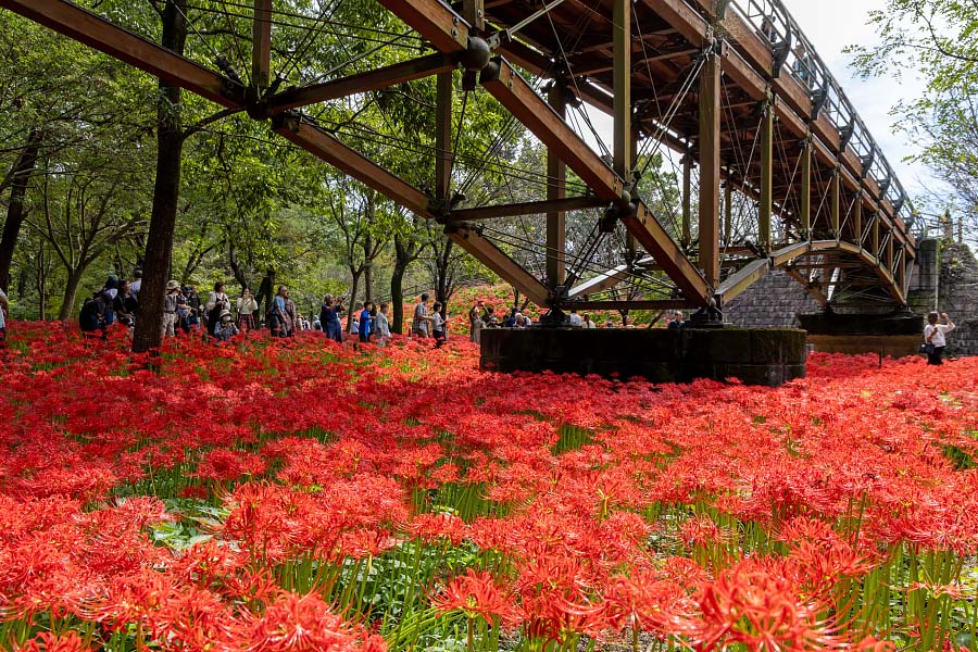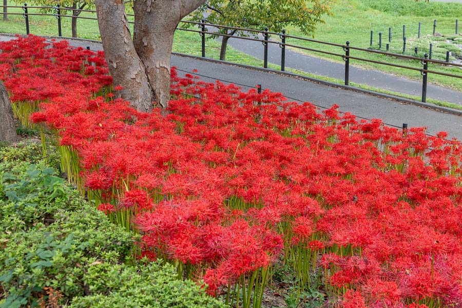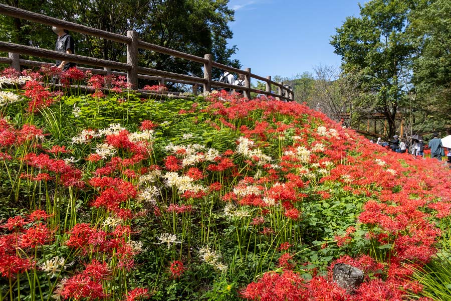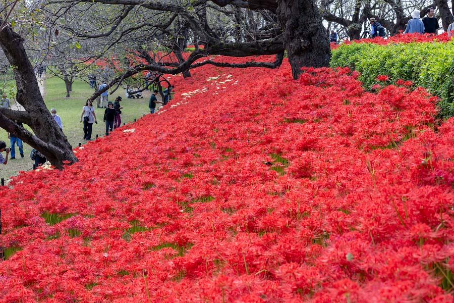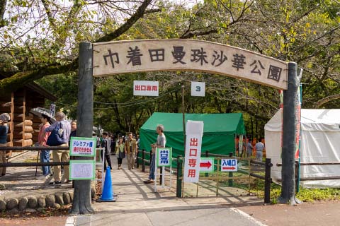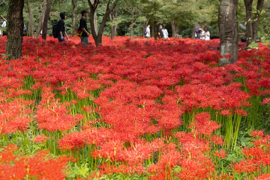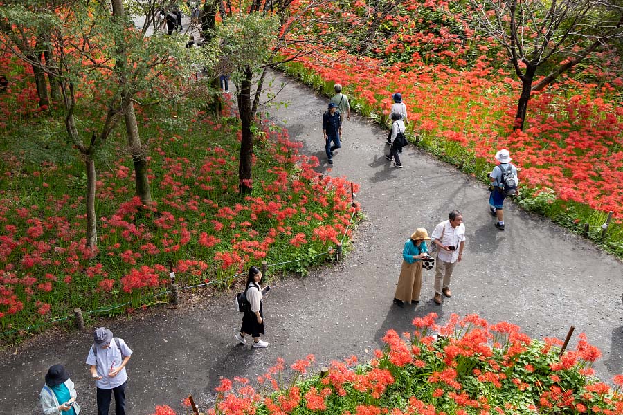 ![]() 市内を流れる高麗(こま)川がギリシア文字のΩ(オメガ)をひっくり返したような形で大きく蛇行する箇所があって、この川に囲まれた一角が上空から見ると巾着(きんちゃく)の形に似ていることから「巾着田」と呼ばれています。 もともとは田んぼの畦などに自生していた彼岸花ですが、その後、地元自治体などの手によって整備され、今では高麗川畔(=巾着田の外縁部)に約500万本の大群落を形成し、関東地方きっての彼岸花の名所になりました。 毎年この時期(今年は9/19〜10/8)には「曼珠沙華まつり」が開催され多くの来訪者で賑わっています。 |