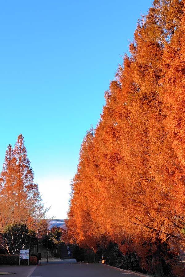 千葉県柏市の「県立柏の葉公園」にもメタセコイアの並木があって、晩秋のひときわ赤味を帯びた夕陽に映えて見事です。