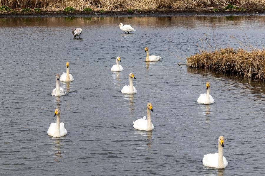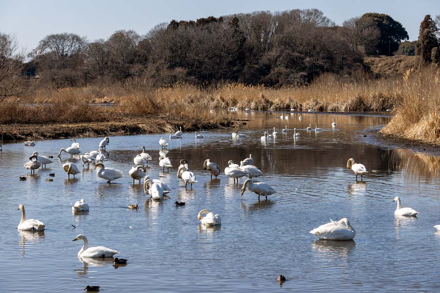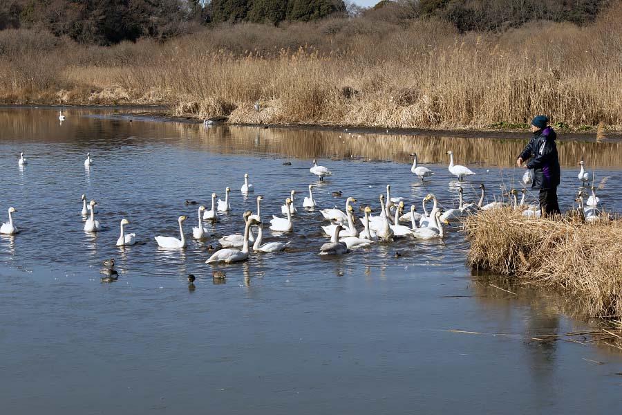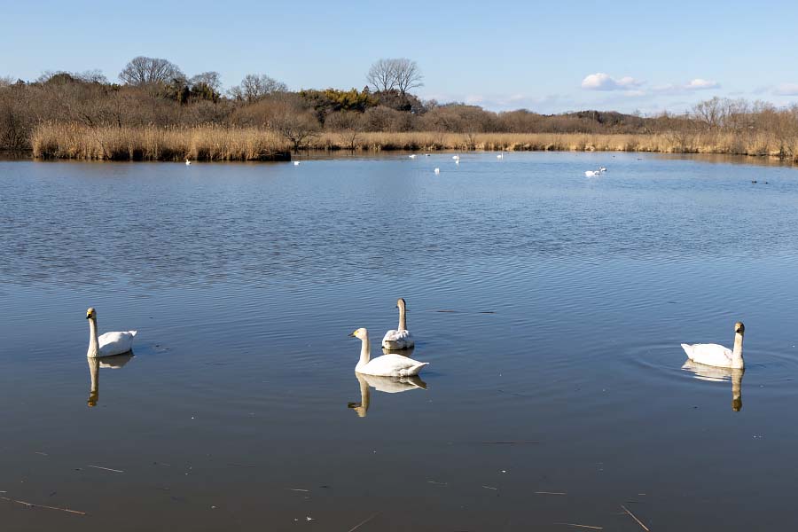 | 白鳥の飛来数では印西市の白鳥の郷の方が多いですが、菅生沼は白鳥だけでなく水辺の景観がとても表情豊かで、絵的には別趣の面白さがあるように思いました。 |